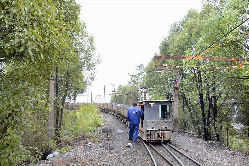 タクシーを下車した後、まず訪れたのは 「主平窿」 と記された 坑口でした。 砿石輸送に使用されている 坑口です。 電気機関車の牽く空車列車が、途中まで 中に入ったところで停まっています。 坑口の 右方向には、選砿施設とを結ぶ線路が延びています。 一方 左手には、別の坑口に続く線路が延びているのですが、レールは錆びていて 最近は使われていない模様です。 |