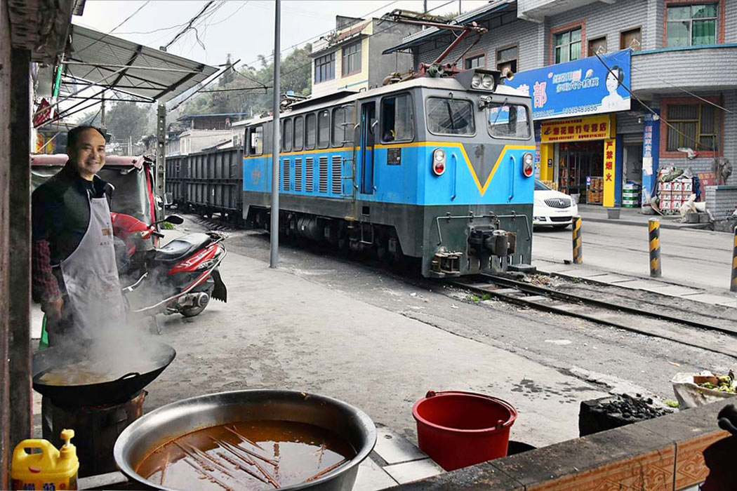 併用軌道のある紅炉街では 食堂の店先を 空車列車が通過して行きます。 中華鍋が 湯気を漂わせていて、食欲をそそります。 |
