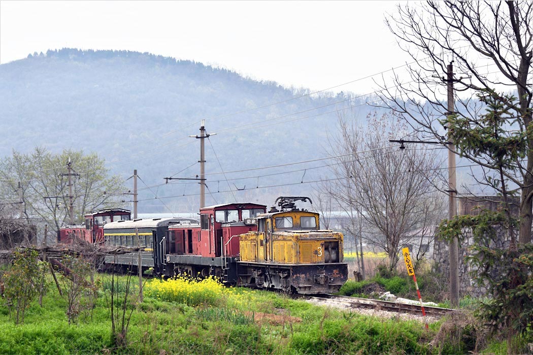 2時間の撮影では 移動時間も限られています。 前日に下見をした結果から、今回の撮影地点は 菜の花が季節を迎えている 廟山地区に絞ろうということになりした。 翌朝 7時50分になると、11号ディーゼル機関車の曳く 職員輸送列車がやってきました。 この日は 編成の後部に、なんと 回送の13号ディーゼル機関車、03号電気機関車を繋いでいます。 |