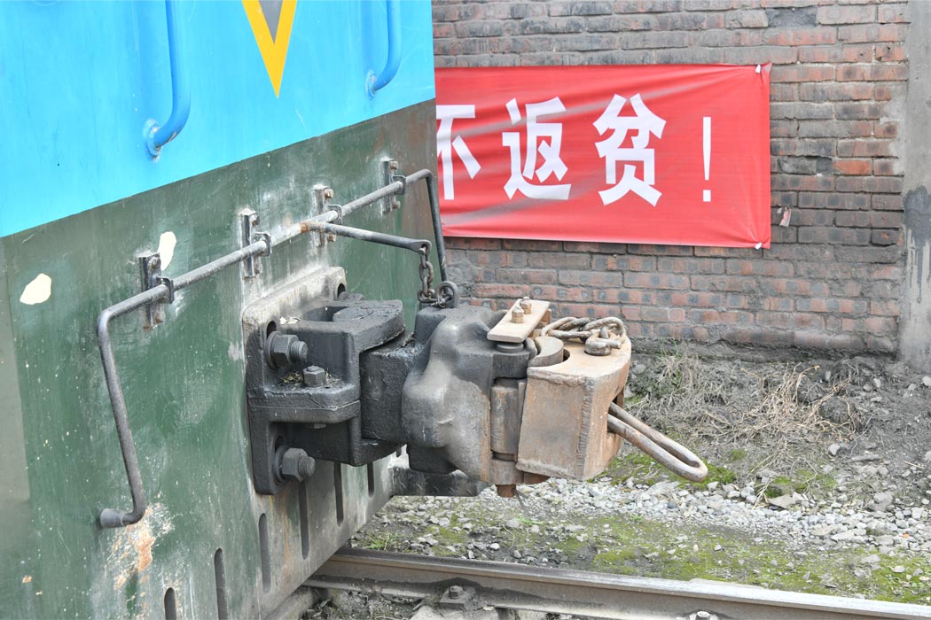 この軌道では、韋家溝(七井)-虹炉鎮 間 の列車と 紅炉鎮-双石橋 間 の列車とでは、貨車のタイプだけでなく 連結器も異なっています。 昨春 紅炉鎮 - 双石橋 間 で活躍していた 06号機 が 韋家溝 側 に来ているのを不思議に思って 連結器をよく見ると、自動連結器の先に ピン・リンク式に対応できる 特殊なアダプターを取り付けています。 |