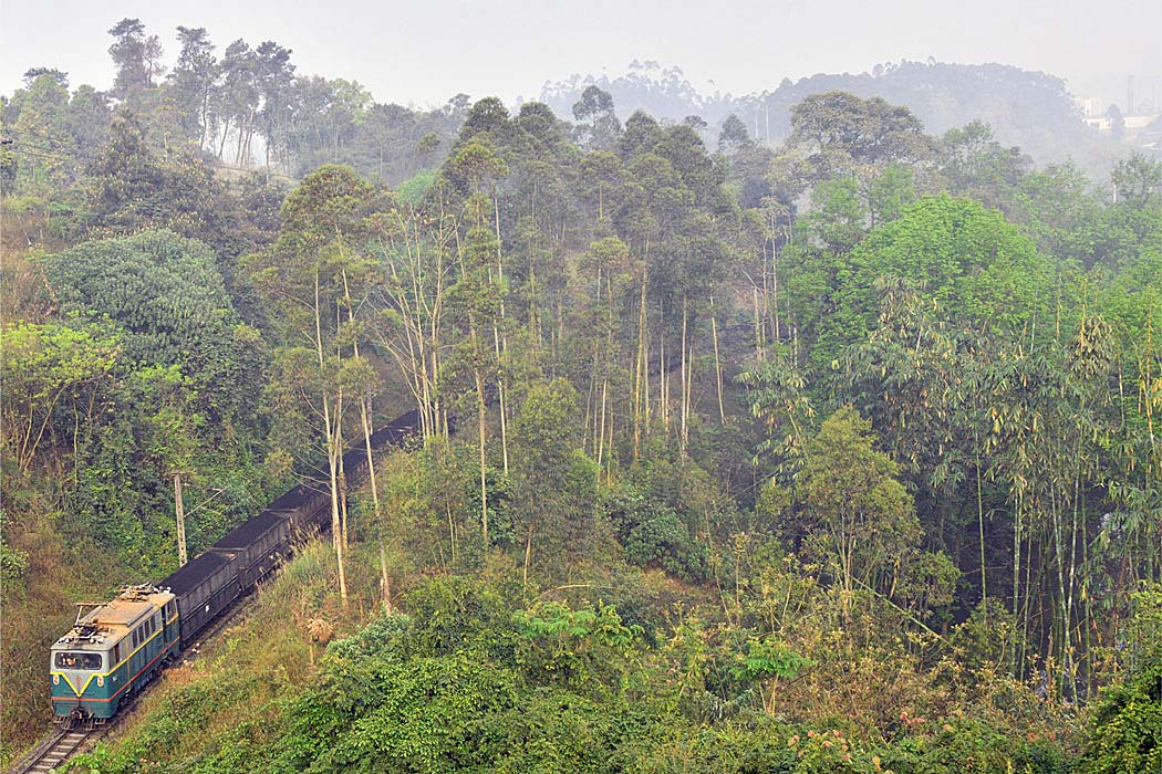 石炭の荷降作業を撮ったあとは、楼子坡の俯瞰ポイントへと向かいます。 ところが 1年前にはなかった ズリ捨て場が造成され、まるでお立ち台のようになっており、様子が一変していました。 9時50分、先ほどの 03号機が 空車列車を曳いて 通過して行きました。 |