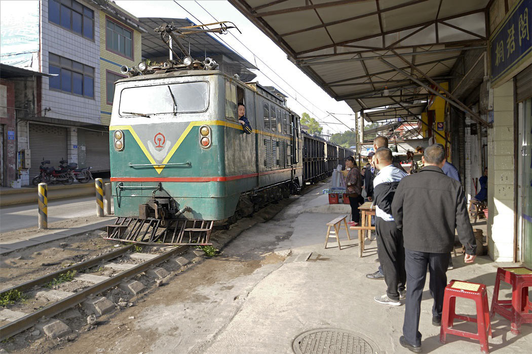 続いて下ってくる石炭列車は、紅炉街 の街中で待ち構えることになりました。 9時頃、03号機の曳く石炭列車が ノノロと徐行しながら 店先を通過して行きます。 |