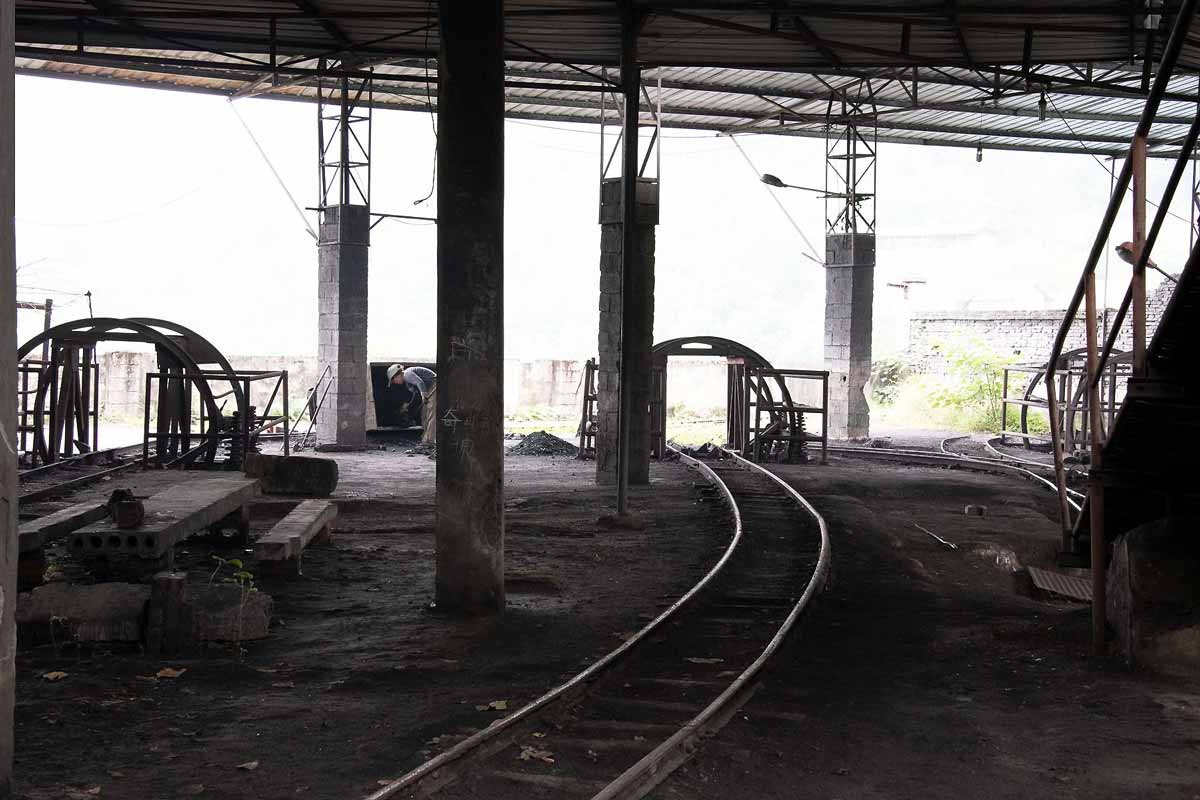 四川省の濾県という場所にある 狐狸坡炭砿 を訪れた話の後編です。 ゆっくりと進む 石炭列車の後を追って 積出施設にやって来たのですが、機関車は すぐに単機で戻って行ってしまいました。 残された私達は、施設の様子を見て回ることにしました。 積出施設内では、線路の上に 雨除けの屋根が張ってありました。 |