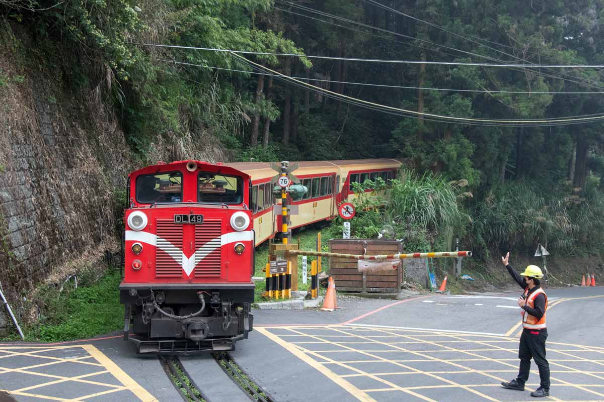 奮起湖駅の踏切で試運転列車(49号機) 14:44に発車して十字路へと向かう列車だそうです。 このあと 14:59発のバスに乗って嘉義へと戻ります。 76号踏切 45.7km 地点 |