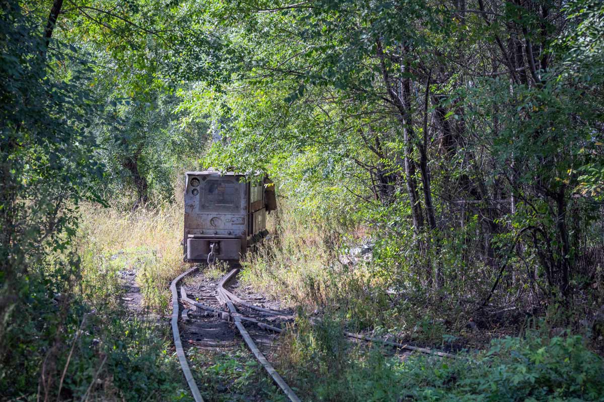 |  | ズリ捨ての列車は、一旦 チップラー小屋の脇を通り過ぎると 更に先に進み、今度は 推進運転で トロッコを 押し始めました。 車列の先には、チップラーが 見えています。 一方 すぐ横には 車軸が外れたトロッコが 放置されています。 | |