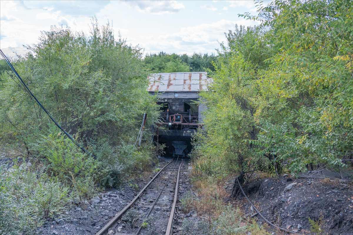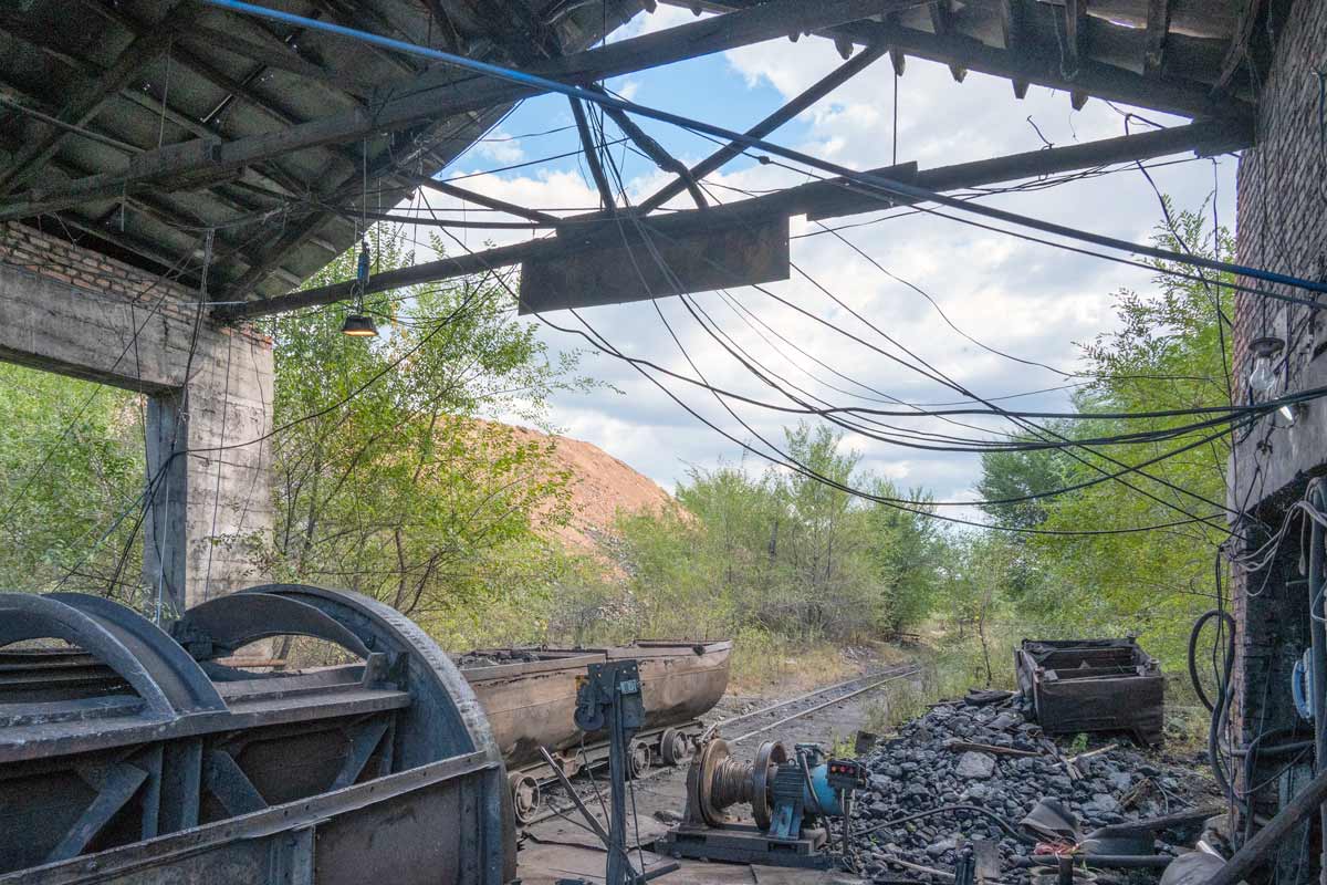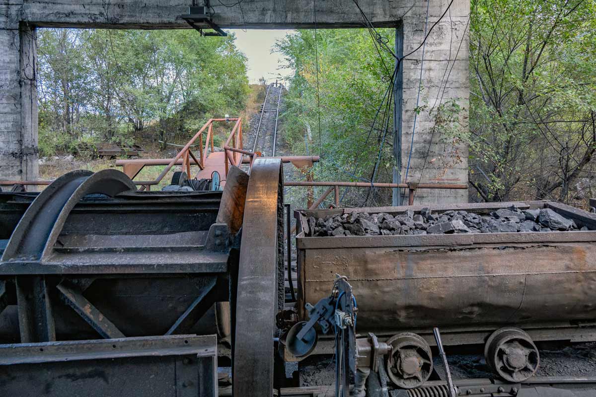 |  | インクライン沿いに、ボタ山の上に登ってみます。 振り返ると、チップラー小屋の下には 専用のトロッコが見えていました。 | |